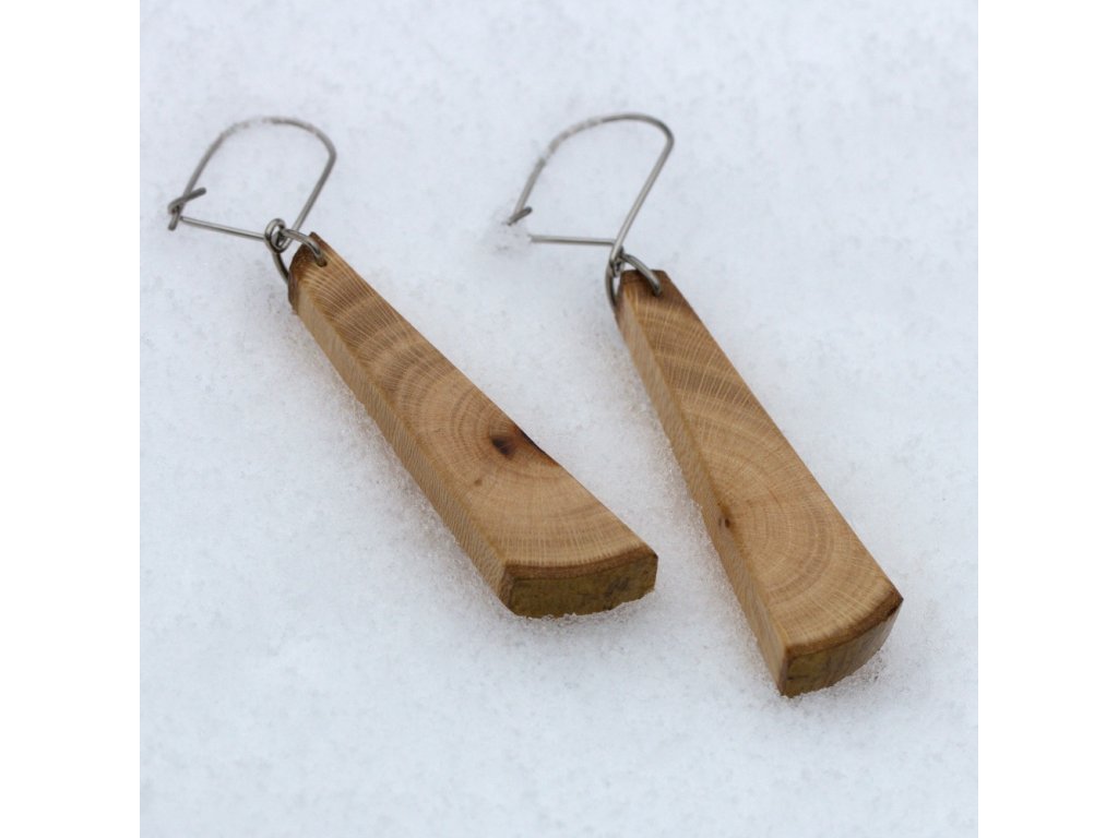 Výška dřevěné části: asi 40 mm, šířka: asi 10 mm (velikost a vzor na se u jednotlivých kusů mění, každý pár náušnic je jedinečný).